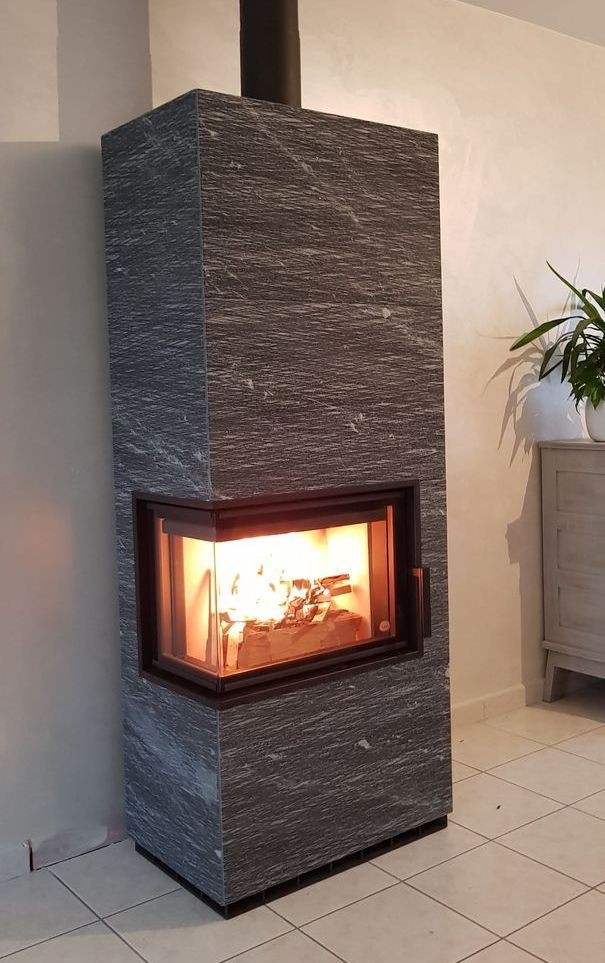 Il n’a jamais été aussi facile de s’occuper d’un brasier. La porte s’ouvre vers le haut et permet un meilleur accès au foyer. Habillage en Artstone blanc , tablette granit noir , porte relevale. Accueillant des bûches jusqj'à 50 cm de long, et pouvant recevoir un kit de masse d'accumaktion POWERSTONE
