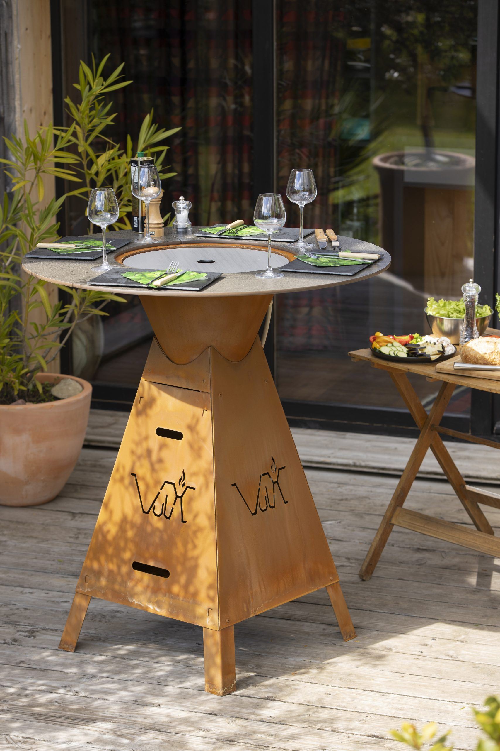 Charbon de bois ou Gaz, réversible en 1 min. Table haute type mange debout. inclus plateau central, grille de cuisson, kit raccordement et bruleur Gaz, ou charbon de bois. Fonctionnement au gaz avec une plaque en inox alimentaire, ou au charbon de bois avec une grille de cuisson.